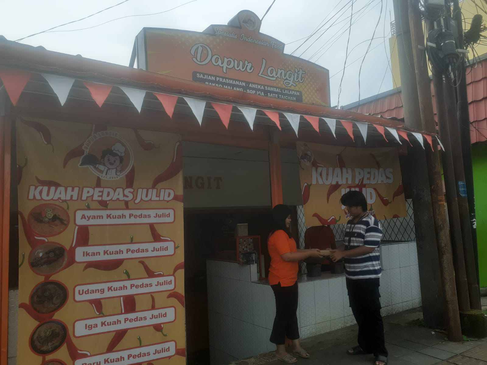 Terlihat Crew karyawan Resto Dapur Langit sedang membagi-bagikan bingkisan berbentuk kotak kepada Warga sekitar.